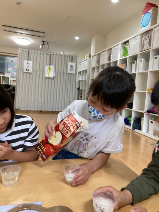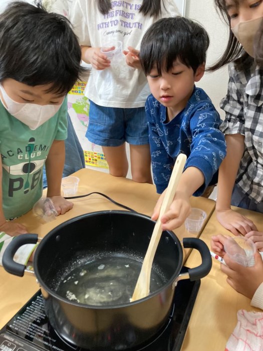 ↑こちらはお湯に粉ゼラチンをみんなで少しづつ入れて交代で混ぜて溶かしている様子です。