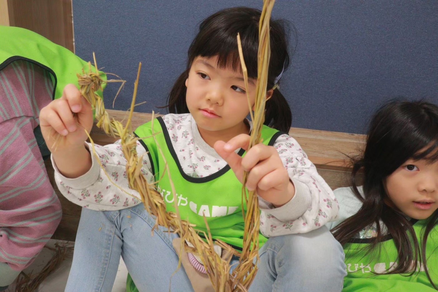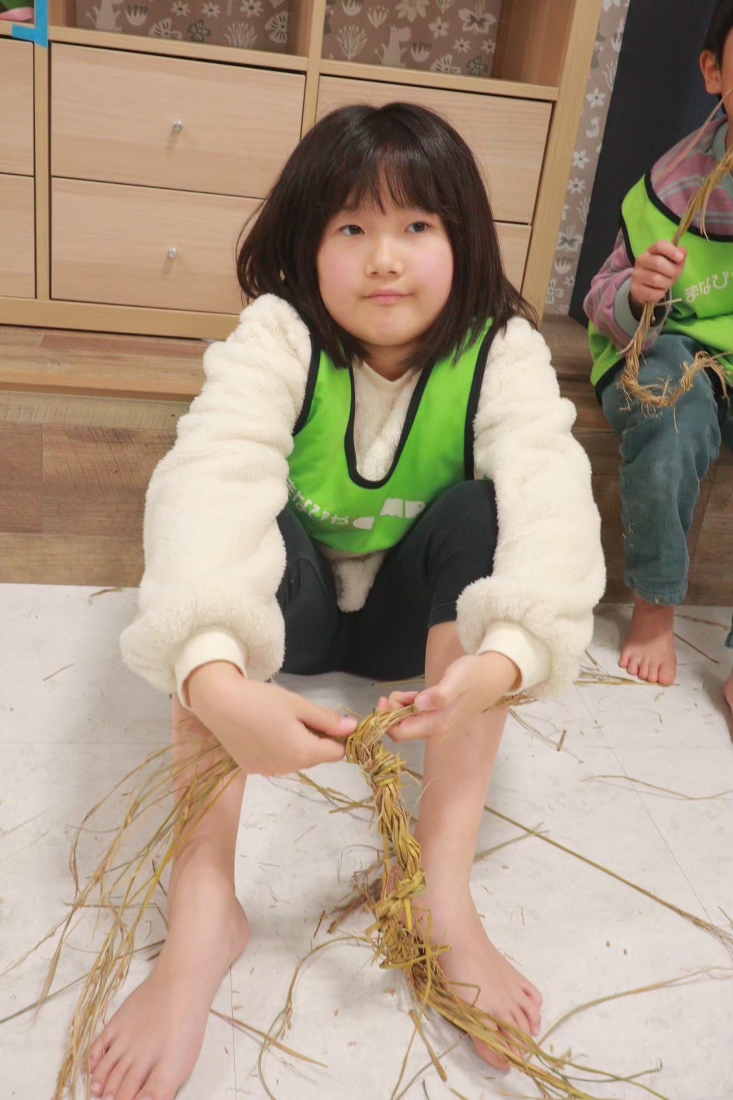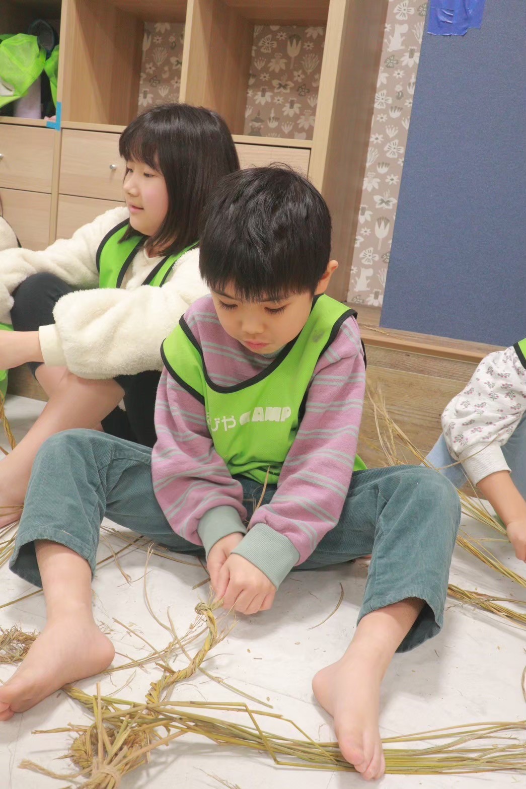 捻じったり編んだりする向きが決まっているので混乱しますが、お友だちと協力したり、小さな手や足を駆使して、一生懸命編んでいました👀✨