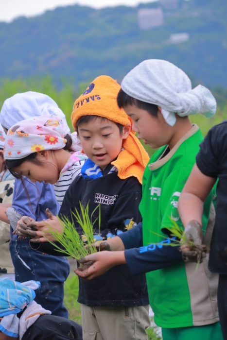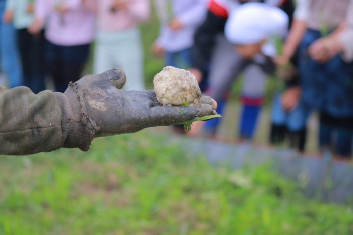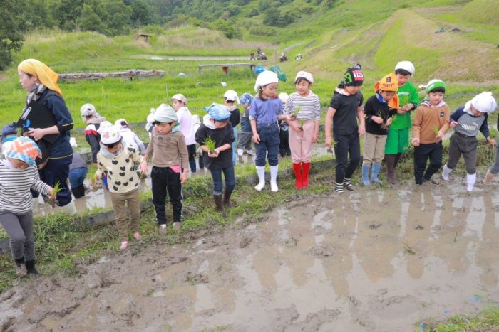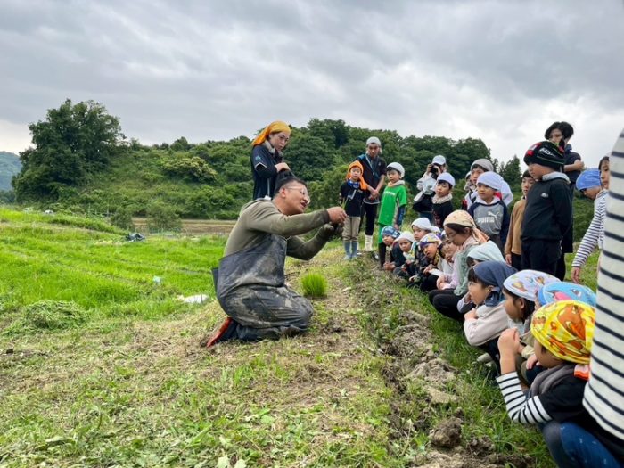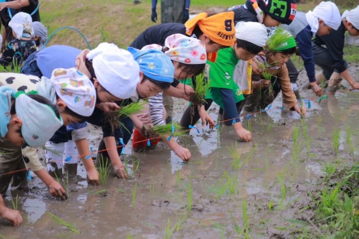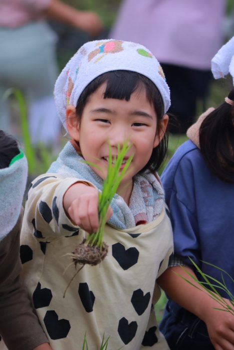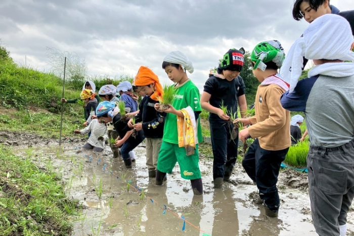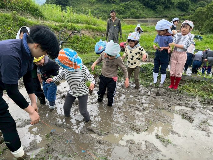 初めての泥の感触を楽しんだり、「ちょっと冷たいで、気を付けや~😏」と初参加のお友達に教えてくれる子がいたりと、ワイワイ田んぼに入っていきます!